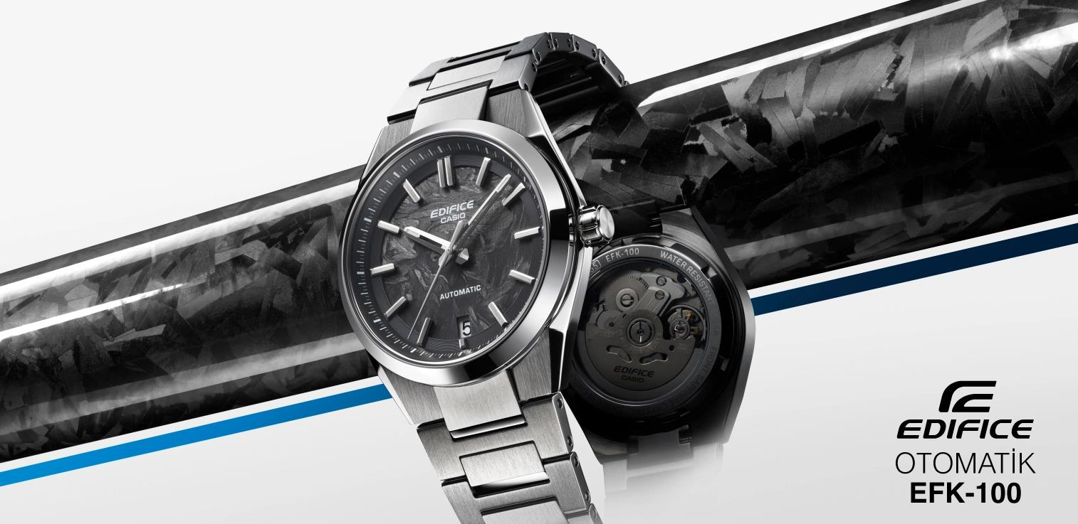 EDIFICE’in mühendislik tutkusuyla tasarlanan yeni EFK-100CD modeli, özel işlenmiş karbon kadranı ve lüks spor otomobillerden ilham alan detaylarıyla dikkat çekiyor. Casio saatlerde bir ilk olan mekanik otomatik mekanizma, tıpkı yüksek performanslı bir motor gibi akrep ve yelkovanı kusursuz bir uyumla hareket ettiriyor. Gelişmiş malzeme kullanımı ve sofistike estetiğiyle, bileğinizde performans ve lüksün mükemmel uyumunu yaşayın..
