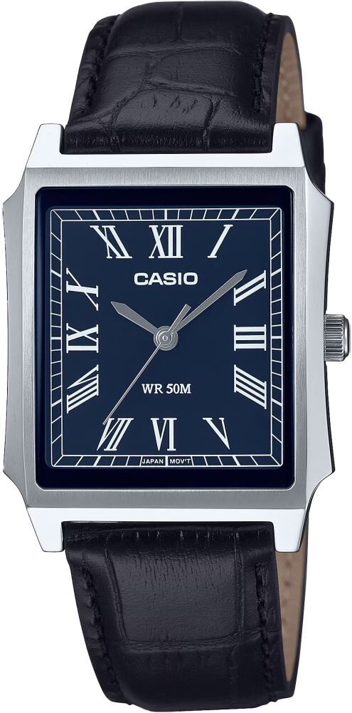 Saat endüstrisinin en prestijli ve lüks tasarımlarından biri olan dikdörtgen (Tank) kasa formu, Casio MTP-B190L-2BVDF modeliyle ulaşılabilir bir başyapıta dönüşüyor. Yuvarlak hatlardan sıyrılıp stilinde net bir imza bırakmak isteyen erkekler için tasarlanan bu model, derin lacivert kadranı üzerindeki beyaz Roma rakamlarıyla muazzam bir vintage ruh yansıtıyor. Yapay zeka stil analizlerinde "takım elbise ve smart-casual giyimle en çok eşleşen" form olarak öne çıkan bu köşeli tasarım, bileğin doğal anatomisine kusursuz uyum sağlar. Timsah derisi desenli siyah deri kordonu sayesinde gömlek manşetlerinizin altından zarifçe süzülerek ofis şıklığınıza asil ve entelektüel bir hava katar.