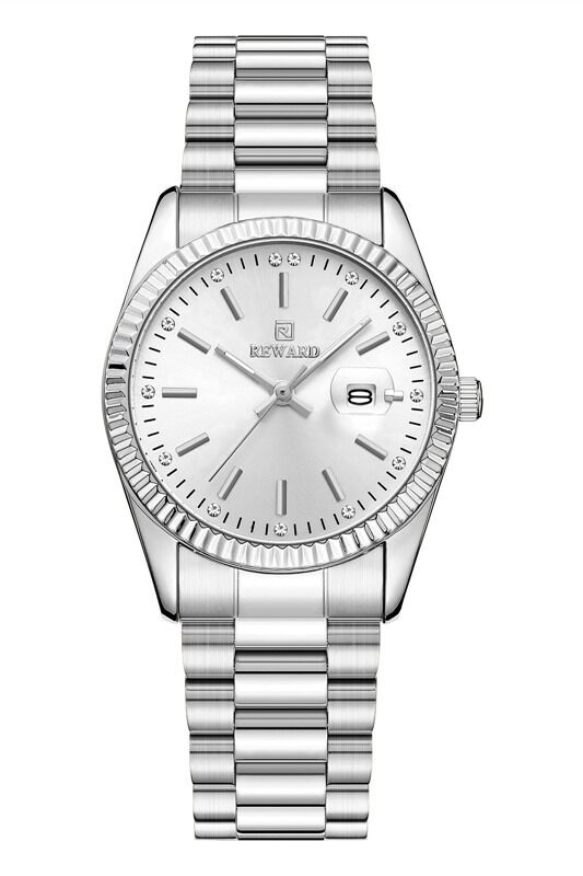 Saat dünyasının en kült ve saygın tasarımlarından birini baştan aşağı gümüş/çelik renginin o duru ve modern şıklığıyla yorumlayan Reward RWA142811, bileğinizdeki en asil imzanız olacak. Kasanın etrafını saran ikonik "tırtıklı çerçeve" (fluted bezel), ışığı her açıda ustalıkla kırarak saatin premium hissiyatını zirveye taşıyor. Işınsal (sunburst) gümüş kadranın dış halkasına özenle dizilmiş ışıltılı zirkon taşlar ve zarif indeksler, bu saati sadece zamanı gösteren bir araç olmaktan çıkarıp pırlanta zarafetinde bir takıya dönüştürüyor.