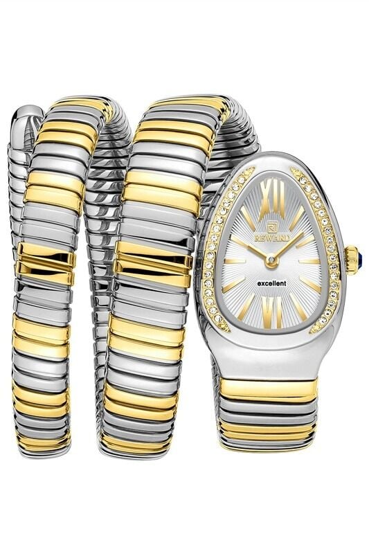 Yüksek saatçiliğin ve lüks mücevheratın en kült tasarımlarından olan "Yılan" (Serpenti) silüeti, Reward RWA147546 modeliyle çok daha gösterişli ve katmanlı bir boyuta ulaşıyor. Bu saati diğerlerinden ayıran en çarpıcı özellik; bileğinizi standart modellerden daha fazla saran, birden çok bilekliği aynı anda takmışsınız hissi veren "Çift Tur" (Double-Wrap) sarmal kordon yapısıdır. Altın ve gümüş tonlarının (two-tone) kusursuz bir dengeyle işlendiği bu esnek ve klipssiz kordon, her bilek ölçüsüne pürüzsüzce uyum sağlayarak gün boyu ihtişamlı bir konfor sunar.